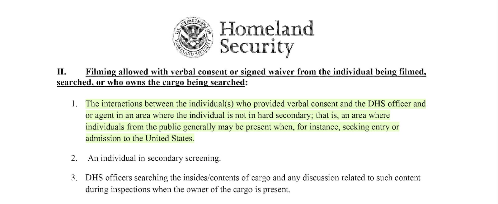 DHS guidance for third-party production companies allows filming of interactions between officers and noncitizens in public locations only with consent. But it is unclear whether DHS and ICE employees themselves obtain consent from noncitizens before filming.